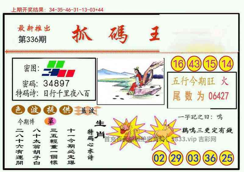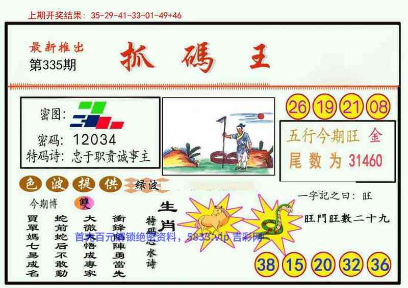 【精解抓码王】开(牛17) 336期:日行千里夜八百 【主攻抓肖】牛猪羊兔蛇虎猴马龙 【抓码尾数】02467 【抓码双波】蓝绿波 |